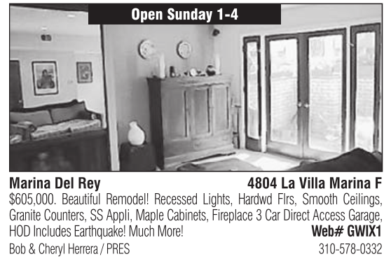 Marina Del Rey 4804 La Villa Marina F $605,000. Beautiful Remodel! Recessed Lights, Hardwd Flrs, Smooth Ceilings, Granite Counters, SS Appli, Maple Cabinets, Fireplace 3 Car Direct Access Garage, HOD Includes Earthquake! Much More! Web# GWIX1 Bob & Cheryl Herrera / PRES 310-578-0332