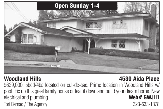 Woodland Hills 4530 Aida Place $629,000. 5bed/4ba located on cul-de-sac. Prime location in Woodland Hills w/ pool. Fix up this great family house or tear it down and build your dream home. New electrical and plumbing. Web# GWJH1