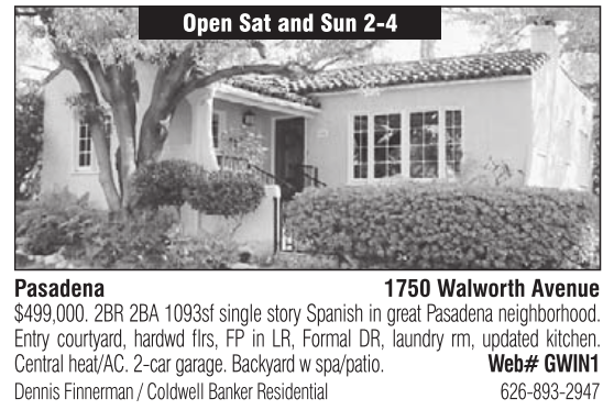Pasadena 1750 Walworth Avenue $499,000. 2BR 2BA 1093sf single story Spanish in great Pasadena neighborhood. Entry courtyard, hardwd flrs, FP in LR, Formal DR, laundry rm, updated kitchen. Central heat/AC. 2-car garage. Backyard w spa/patio. Web# GWIN1 Dennis Finnerman / Coldwell Banker Residential 626-893-2947