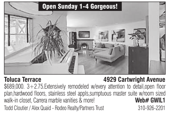 Toluca Terrace 4929 Cartwright Avenue $689,000. 3+2.75.Extensively remodeled w/every attention to detail,open floor plan,hardwood floors, stainless steel appls,sumptuous master suite w/room sized walk-in closet, Carrera marble vanities & more! Web# GWIL1