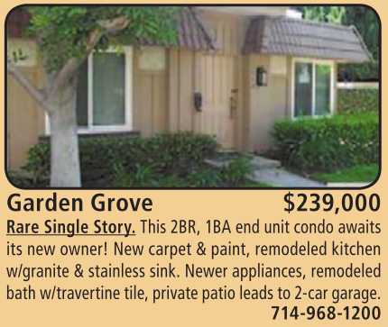 Garden Grove $239,000 Rare Single Story. This 2BR, 1BA end unit condo awaits