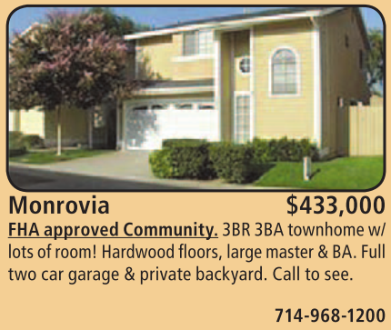 Monrovia $433,000 FHA approved Community. 3BR 3BA townhome w/