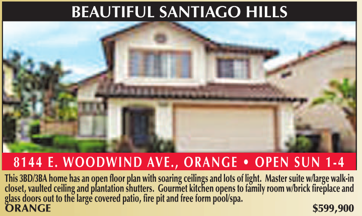 BEAUTIFUL SANTIAGO HILLS 8144 E. WOODWIND AVE., ORANGE • OPEN SUN 1-4 This 3BD/3BA home has an open floor plan with soaring ceilings and lots of light. Master suite w/large walk-in closet, vaulted ceiling and plantation shutters. Gourmet kitchen opens to family room w/brick fireplace and glass doors out to the large covered patio, fire pit and free form pool/spa. ORANGE $599,900