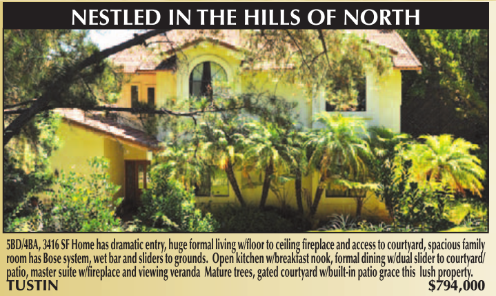 NESTLED IN THE HILLS OF NORTH 5BD/4BA, 3416 SF Home has dramatic entry, huge formal living w/floor to ceiling fireplace and access to courtyard, spacious family room has Bose system, wet bar and sliders to grounds. Open kitchen w/breakfast nook, formal dining w/dual slider to courtyard/ patio, master suite w/fireplace and viewing veranda Mature trees, gated courtyard w/built-in patio grace this lush property. TUSTIN $794,000