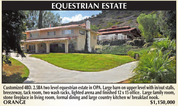 EQUESTRIAN ESTATE Customized 4BD. 2.5BA two level equestrian estate in OPA. Large barn on upper level with in/out stalls, breezeway, tack room, two wash racks, lighted arena and finished 12 x 15 office. Large family room, stone fireplace in living room, formal dining and large country kitchen w/ breakfast nook. ORANGE $1,150,000