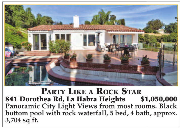 PARTY LIKE A ROCK STAR 841 Dorothea Rd, La Habra Heights $1,050,000 Panoramic City Light Views from most rooms. Black bottom pool with rock waterfall, 5 bed, 4 bath, approx. 3,704 sq ft.