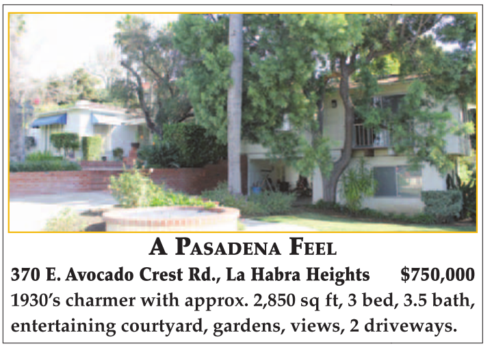 A PASADENA FEEL 370 E. Avocado Crest Rd., La Habra Heights $750,000 1930’s charmer with approx. 2,850 sq ft, 3 bed, 3.5 bath, entertaining courtyard, gardens, views, 2 driveways.