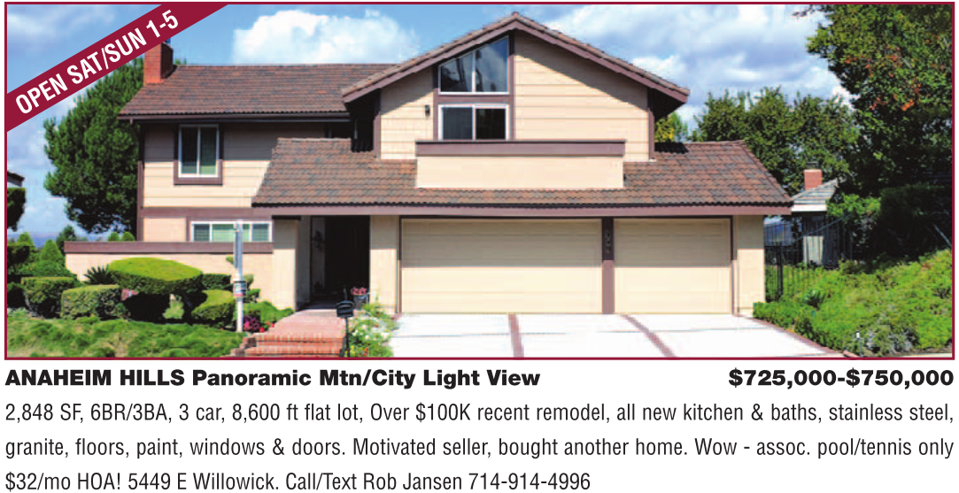 ANAHEIM HILLS Panoramic Mtn/City Light View $725,000-$750,000 2,848 SF, 6BR/3BA, 3 car, 8,600 ft flat lot, Over $100K recent remodel, all new kitchen & baths, stainless steel, granite, floors, paint, windows & doors. Motivated seller, bought another home. Wow - assoc. pool/tennis only $32/mo HOA! 5449 E Willowick. Call/Text Rob Jansen 714-914-4996