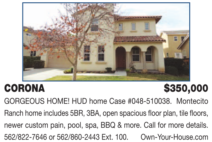 CORONA $350,000 GORGEOUS HOME! HUD home Case #048-510038. Montecito Ranch home includes 5BR, 3BA, open spacious floor plan, tile floors, newer custom pain, pool, spa, BBQ & more. Call for more details. 562/822-7646 or 562/860-2443 Ext. 100. Own-Your-House.com