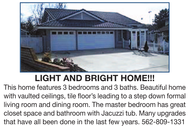 LIGHT AND BRIGHT HOME!!! This home features 3 bedrooms and 3 baths. Beautiful home with vaulted ceilings, tile floor’s leading to a step down formal living room and dining room. The master bedroom has great closet space and bathroom with Jacuzzi tub. Many upgrades that have all been done in the last few years. 562-809-1331