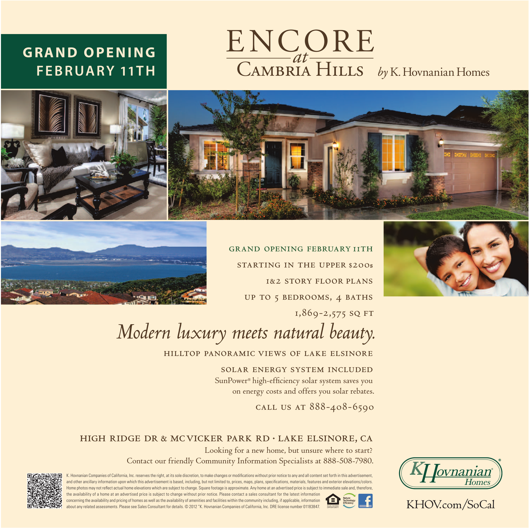 G RA N D O P E N I N G F E B R UA R Y 11T H by K.Hovnanian Homes grand opening february 11th starting in the upper $200s 1&2 story floor plans up to 5 bedrooms, 4 baths 1,869-2,575 sq ft Modern luxury meets natural beauty. hilltop panoramic views of lake elsinore solar energy system included SunPower ® high-efficiency solar system saves you on energy costs and offers you solar rebates. call us at 888-408-6590 high ridge dr & mc vicker park rd · lake elsinore, ca Looking for a new home, but unsure where to start? Contact our friendly Community Information Specialists at 888-508-7980. K. Hovnanian Companies of California, Inc. reserves the right, at its sole discretion, to make changes or modifications without prior notice to any and all content set forth in this advertisement, and other ancillary information upon which this advertisement is based, including, but not limited to, prices, maps, plans, specifications, materials, features and exterior elevations/colors. Home photos may not reflect actual home elevations which are subject to change. Square footage is approximate. Any home at an advertised price is subject to immediate sale and, therefore, the availability of a home at an advertised price is subject to change without prior notice. Please contact a sales consultant for the latest information concerning the availability and pricing of homes as well as the availability of amenities and facilities within the community including, if applicable, information about any related assessments. Please see Sales Consultant for details. © 2012 “K. Hovnanian Companies of California, Inc. DRE license number 01183847. KHOV.com/SoCal