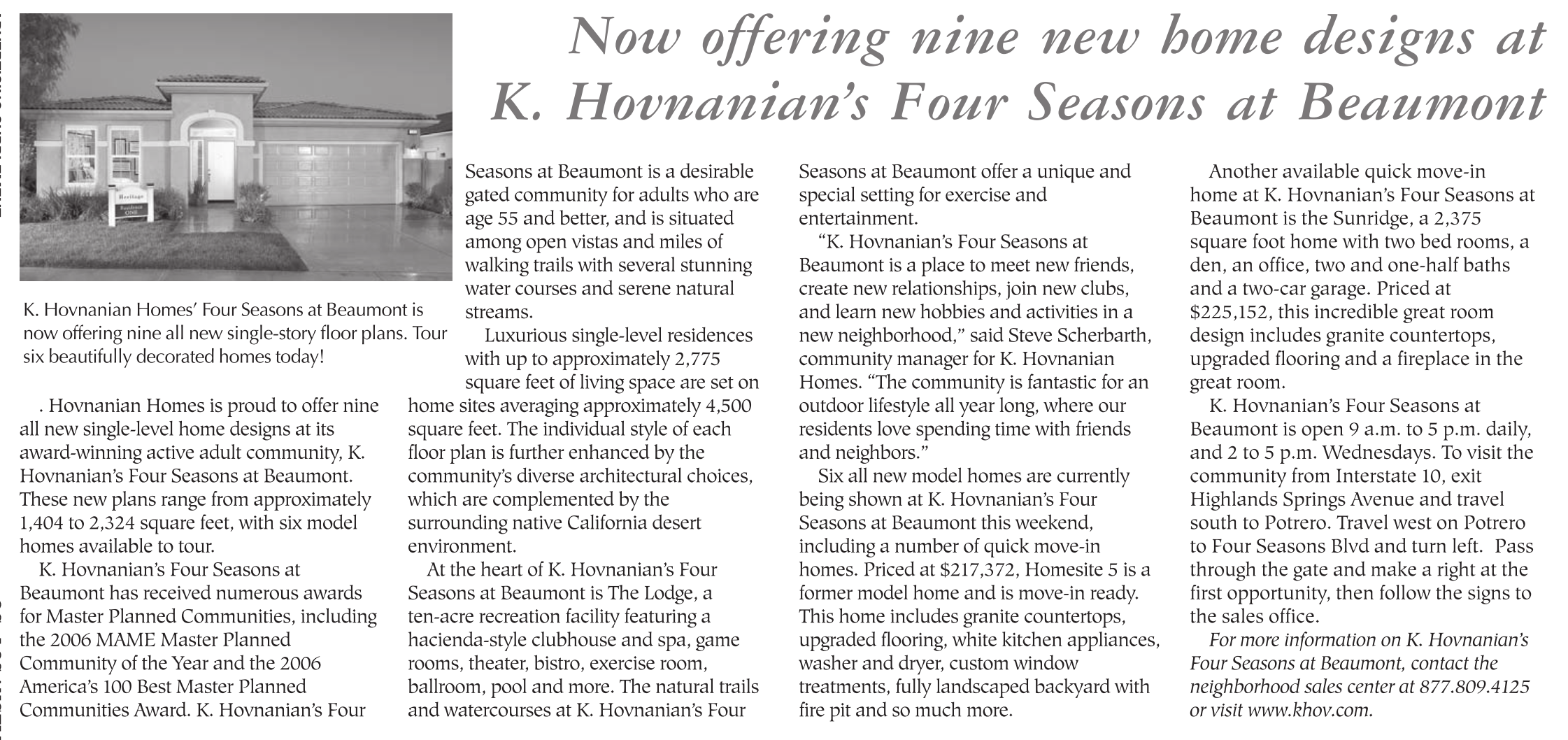 K. Hovnanian’s Four Seasons at Beaumont is open 9 a.m. to 5 p.m. daily, and 2 to 5 p.m. Wednesdays. To visit the community from Interstate 10, exit Highlands Springs Avenue and travel south to Potrero. Travel west on Potrero to Four Seasons Blvd and turn left. Pass through the gate and make a right at the first opportunity, then follow the signs to the sales office.