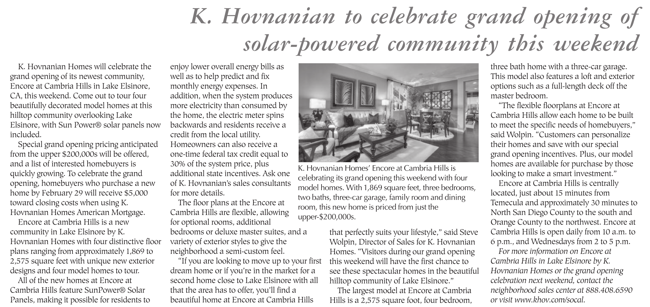 For more information on Encore at Cambria Hills in Lake Elsinore by K. Hovnanian Homes or the grand opening celebration next weekend, contact the neighborhood sales center at 888.408.6590 or visit www.khov.com/socal.
