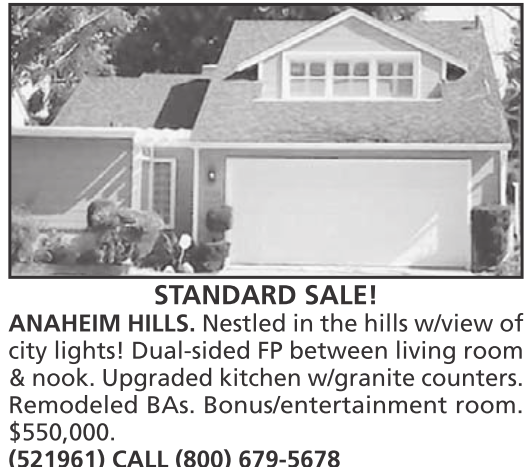 ANAHEIM HILLS. Nestled in the hills w/view of city lights! Dual-sided FP between living room & nook. Upgraded kitchen w/granite counters. Remodeled BAs. Bonus/entertainment room. $550,000. (521961) CALL (800) 679-5678