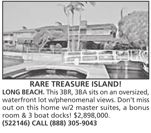 LONG BEACH. This 3BR, 3BA sits on an oversized, waterfront lot w/phenomenal views. Don’t miss out on this home w/2 master suites, a bonus room & 3 boat docks! $2,898,000. (522146) CALL (888) 305-9043