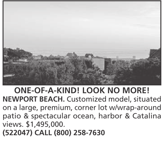 NEWPORT BEACH. Customized model, situated on a large, premium, corner lot w/wrap-around patio & spectacular ocean, harbor & Catalina views. $1,495,000. (522047) CALL (800) 258-7630