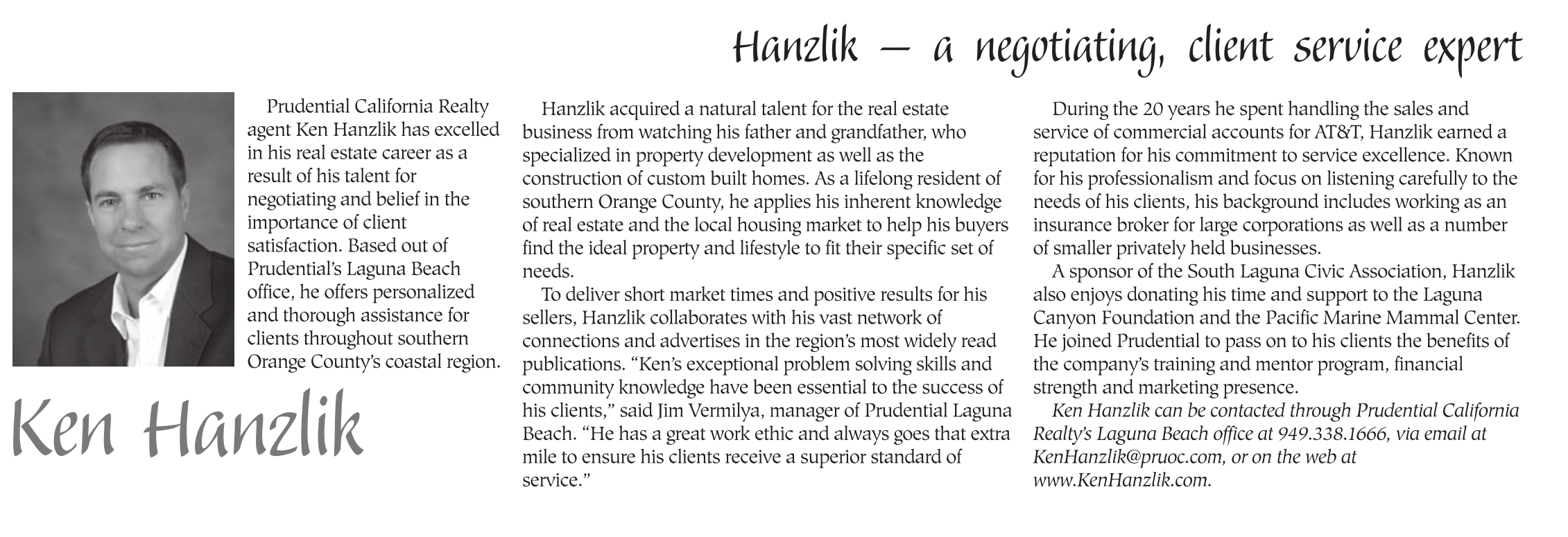 Prudential California Realty agent Ken Hanzlik has excelled in his real estate career as a result of his talent for negotiating and belief in the importance of client satisfaction. Based out of Prudential’s Laguna Beach office, he offers personalized and thorough assistance for clients throughout southern Orange County’s coastal region. Ken Hanzlik Hanzlik – a negotiating, client service expert Hanzlik acquired a natural talent for the real estate business from watching his father and grandfather, who specialized in property development as well as the construction of custom built homes. As a lifelong resident of southern Orange County, he applies his inherent knowledge of real estate and the local housing market to help his buyers find the ideal property and lifestyle to fit their specific set of needs. To deliver short market times and positive results for his sellers, Hanzlik collaborates with his vast network of connections and advertises in the region’s most widely read publications. “Ken’s exceptional problem solving skills and community knowledge have been essential to the success of his clients,” said Jim Vermilya, manager of Prudential Laguna Beach. “He has a great work ethic and always goes that extra mile to ensure his clients receive a superior standard of service.” During the 20 years he spent handling the sales and service of commercial accounts for AT&T, Hanzlik earned a reputation for his commitment to service excellence. Known for his professionalism and focus on listening carefully to the needs of his clients, his background includes working as an insurance broker for large corporations as well as a number of smaller privately held businesses. A sponsor of the South Laguna Civic Association, Hanzlik also enjoys donating his time and support to the Laguna Canyon Foundation and the Pacific Marine Mammal Center. He joined Prudential to pass on to his clients the benefits of the company’s training and mentor program, financial strength and marketing presence. Ken Hanzlik can be contacted through Prudential California Realty’s Laguna Beach office at 949.338.1666, via email at KenHanzlik@pruoc.com, or on the web at www.KenHanzlik.com.