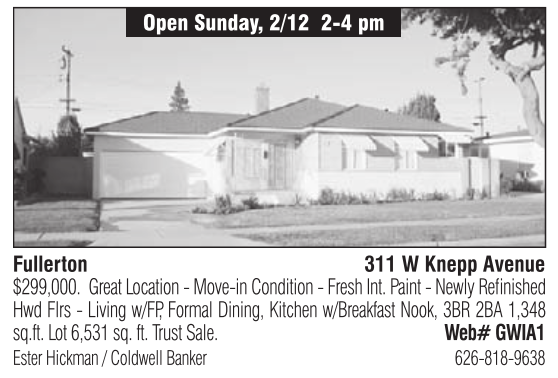 $299,000. Great Location - Move-in Condition - Fresh Int. Paint - Newly Refinished Hwd Flrs - Living w/FP, Formal Dining, Kitchen w/Breakfast Nook, 3BR 2BA 1,348 sq.ft. Lot 6,531 sq. ft. Trust Sale. Web# GWIA1 Ester Hickman / Coldwell Banker 626-818-9638