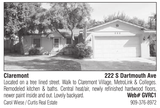 Claremont 222 S Dartmouth Ave Located on a tree lined street. Walk to Claremont Village, MetroLink & Colleges. Remodeled kitchen & baths. Central heat/air, newly refinished hardwood floors, newer paint inside and out. Lovely backyard. Web# GVRC1 Carol Wiese / Curtis Real Estate 909-376-8972