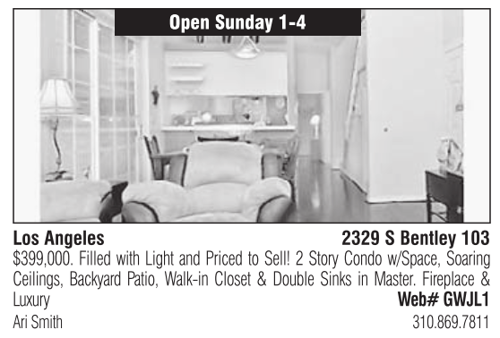 Los Angeles 2329 S Bentley 103 $399,000. Filled with Light and Priced to Sell! 2 Story Condo w/Space, Soaring Ceilings, Backyard Patio, Walk-in Closet & Double Sinks in Master. Fireplace & Luxury Web# GWJL1 Ari Smith 310.869.7811