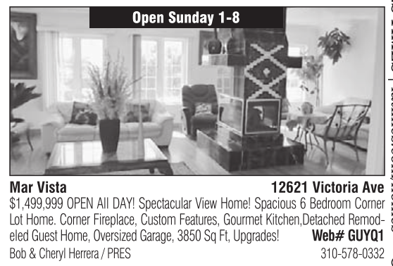 Mar Vista 12621 Victoria Ave $1,499,999 OPEN All DAY! Spectacular View Home! Spacious 6 Bedroom Corner Lot Home. Corner Fireplace, Custom Features, Gourmet Kitchen,Detached Remodeled Guest Home, Oversized Garage, 3850 Sq Ft, Upgrades! Web# GUYQ1