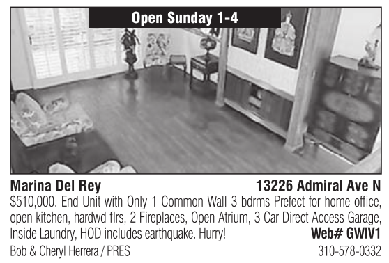 Marina Del Rey 13226 Admiral Ave N $510,000. End Unit with Only 1 Common Wall 3 bdrms Prefect for home office, open kitchen, hardwd flrs, 2 Fireplaces, Open Atrium, 3 Car Direct Access Garage, Inside Laundry, HOD includes earthquake. Hurry! Web# GWIV1