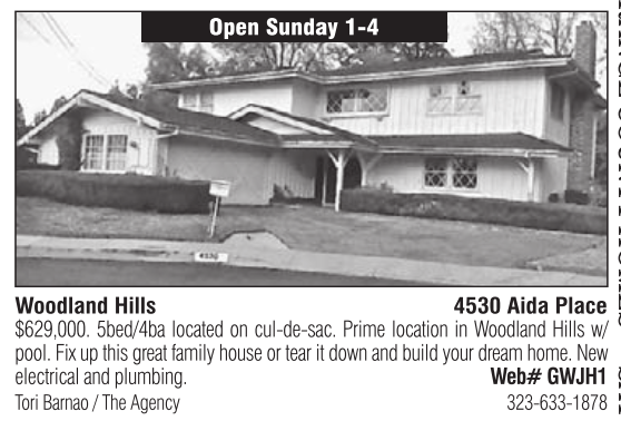 Woodland Hills 4530 Aida Place $629,000. 5bed/4ba located on cul-de-sac. Prime location in Woodland Hills w/ pool. Fix up this great family house or tear it down and build your dream home. New electrical and plumbing. Web# GWJH1