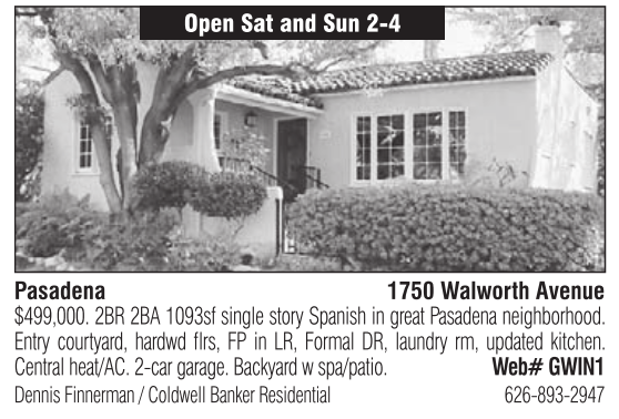 Pasadena 1750 Walworth Avenue $499,000. 2BR 2BA 1093sf single story Spanish in great Pasadena neighborhood. Entry courtyard, hardwd flrs, FP in LR, Formal DR, laundry rm, updated kitchen. Central heat/AC. 2-car garage. Backyard w spa/patio. Web# GWIN1