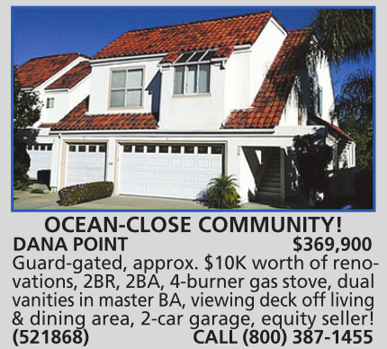 DANA POINT $369,900 Guard-gated, approx. $10K worth of renovations, 2BR, 2BA, 4-burner gas stove, dual