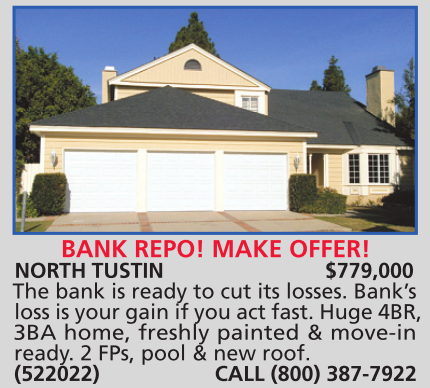NORTH TUSTIN $779,000 The bank is ready to cut its losses. Bank’s loss is your gain if you act fast. Huge 4BR, 3BA home, freshly painted & move-in ready. 2 FPs, pool & new roof. (522022) CALL (800) 387-7922