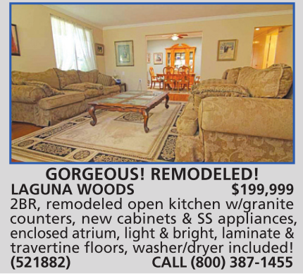 LAGUNA WOODS $199,999 2BR, remodeled open kitchen w/granite counters, new cabinets & SS appliances, enclosed atrium, light & bright, laminate & travertine floors, washer/dryer included! (521882) CALL (800) 387-1455