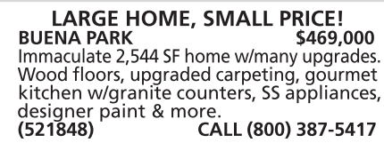 BUENA PARK $469,000 Immaculate 2,544 SF home w/many upgrades. Wood floors, upgraded carpeting, gourmet kitchen w/granite counters, SS appliances, designer paint & more. (521848) CALL (800) 387-5417