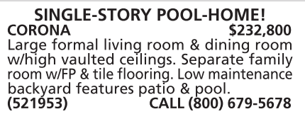 CORONA $232,800 Large formal living room & dining room w/high vaulted ceilings. Separate family room w/FP & tile flooring. Low maintenance backyard features patio & pool. (521953) CALL (800) 679-5678