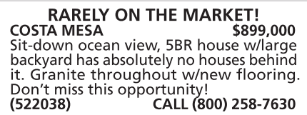 COSTA MESA $899,000 Sit-down ocean view, 5BR house w/large backyard has absolutely no houses behind it. Granite throughout w/new flooring. Don’t miss this opportunity! (522038) CALL (800) 258-7630