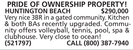 HUNTINGTON BEACH $290,000 Very nice 3BR in a gated community. Kitchen & both BAs recently upgraded. Community offers volleyball, tennis, pool, spa & clubhouse. Very close to ocean! (521797) CALL (800) 387-7940