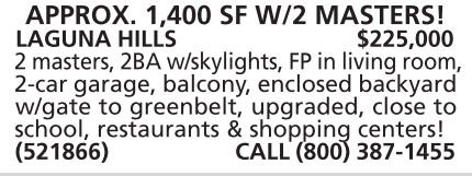 LAGUNA HILLS $225,000 2 masters, 2BA w/skylights, FP in living room, 2-car garage, balcony, enclosed backyard w/gate to greenbelt, upgraded, close to school, restaurants & shopping centers! (521866) CALL (800) 387-1455