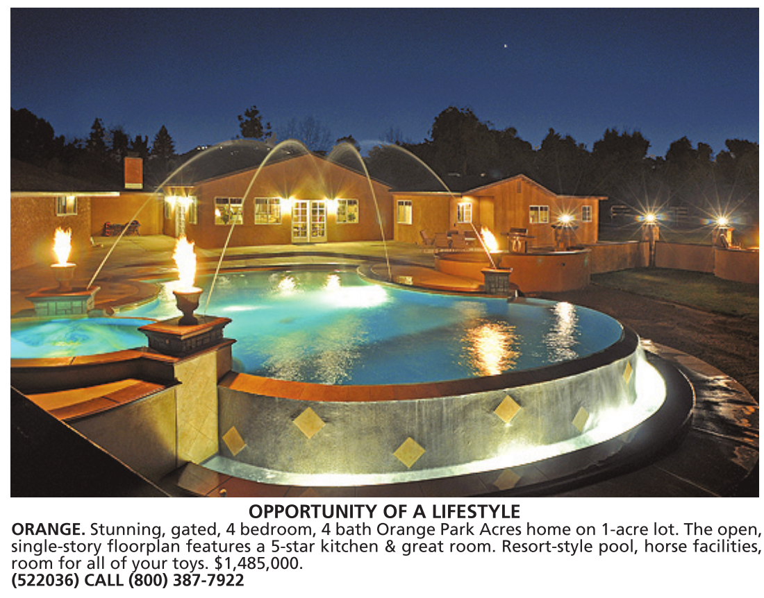 OPPORTUNITY OF A LIFESTYLE ORANGE. Stunning, gated, 4 bedroom, 4 bath Orange Park Acres home on 1-acre lot. The open, single-story floorplan features a 5-star kitchen & great room. Resort-style pool, horse facilities, room for all of your toys. $1,485,000. (522036) CALL (800) 387-7922