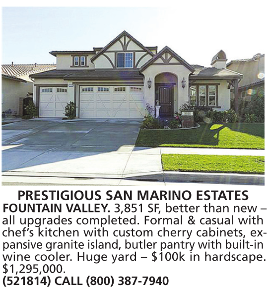 PRESTIGIOUS SAN MARINO ESTATES FOUNTAIN VALLEY. 3,851 SF, better than new – all upgrades completed. Formal & casual with chef’s kitchen with custom cherry cabinets, expansive granite island, butler pantry with built-in wine cooler. Huge yard – $100k in hardscape. $1,295,000. (521814) CALL (800) 387-7940