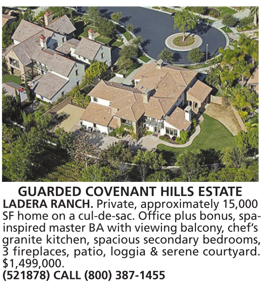GUARDED COVENANT HILLS ESTATE LADERA RANCH. Private, approximately 15,000 SF home on a cul-de-sac. Office plus bonus, spainspired master BA with viewing balcony, chef’s granite kitchen, spacious secondary bedrooms, 3 fireplaces, patio, loggia & serene courtyard. $1,499,000. (521878) CALL (800) 387-1455