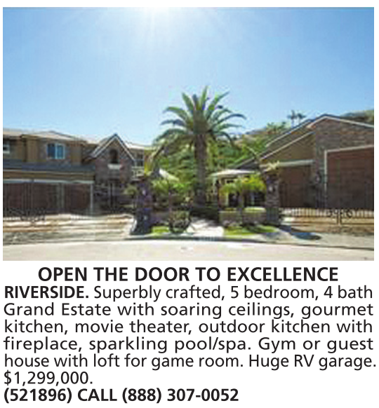 OPEN THE DOOR TO EXCELLENCE RIVERSIDE. Superbly crafted, 5 bedroom, 4 bath Grand Estate with soaring ceilings, gourmet kitchen, movie theater, outdoor kitchen with fireplace, sparkling pool/spa. Gym or guest house with loft for game room. Huge RV garage. $1,299,000. (521896) CALL (888) 307-0052