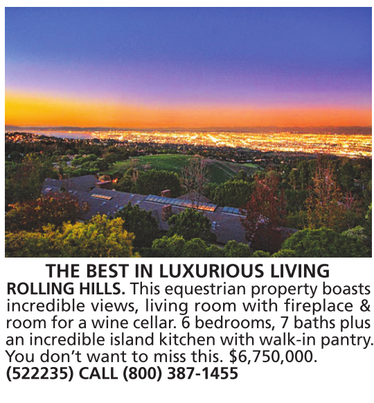 THE BEST IN LUXURIOUS LIVING ROLLING HILLS. This equestrian property boasts incredible views, living room with fireplace & room for a wine cellar. 6 bedrooms, 7 baths plus an incredible island kitchen with walk-in pantry. You don’t want to miss this. $6,750,000. (522235) CALL (800) 387-1455
