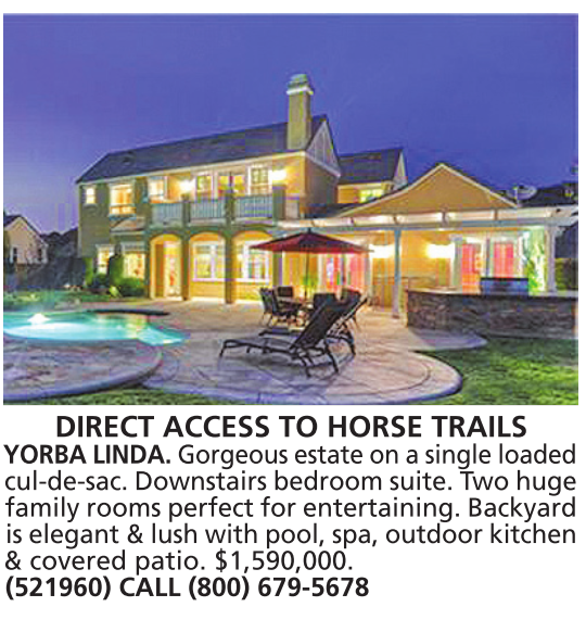 DIRECT ACCESS TO HORSE TRAILS YORBA LINDA. Gorgeous estate on a single loaded cul-de-sac. Downstairs bedroom suite. Two huge family rooms perfect for entertaining. Backyard is elegant & lush with pool, spa, outdoor kitchen & covered patio. $1,590,000. (521960) CALL (800) 679-5678