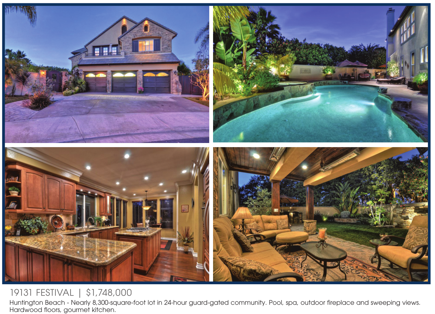 Huntington Beach - Nearly 8,300-square-foot lot in 24-hour guard-gated community. Pool, spa, outdoor fireplace and sweeping views. Hardwood floors, gourmet kitchen.