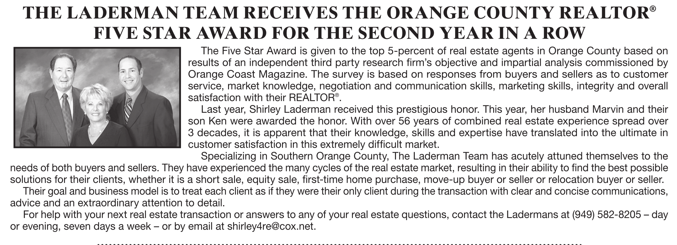 THE LADERMAN TEAM RECEIVES THE ORANGE COUNTY REALTOR ® FIVE STAR AWARD FOR THE SECOND YEAR IN A ROW The Five Star Award is given to the top 5-percent of real estate agents in Orange County based on results of an independent third party research firm’s objective and impartial analysis commissioned by Orange Coast Magazine. The survey is based on responses from buyers and sellers as to customer service, market knowledge, negotiation and communication skills, marketing skills, integrity and overall satisfaction with their REALTOR ® . Last year, Shirley Laderman received this prestigious honor. This year, her husband Marvin and their son Ken were awarded the honor. With over 56 years of combined real estate experience spread over 3 decades, it is apparent that their knowledge, skills and expertise have translated into the ultimate in customer satisfaction in this extremely difficult market. Specializing in Southern Orange County, The Laderman Team has acutely attuned themselves to the needs of both buyers and sellers. They have experienced the many cycles of the real estate market, resulting in their ability to find the best possible solutions for their clients, whether it is a short sale, equity sale, first-time home purchase, move-up buyer or seller or relocation buyer or seller. Their goal and business model is to treat each client as if they were their only client during the transaction with clear and concise communications, advice and an extraordinary attention to detail. For help with your next real estate transaction or answers to any of your real estate questions, contact the Ladermans at (949) 582-8205 – day or evening, seven days a week – or by email at shirley4re@cox.net.