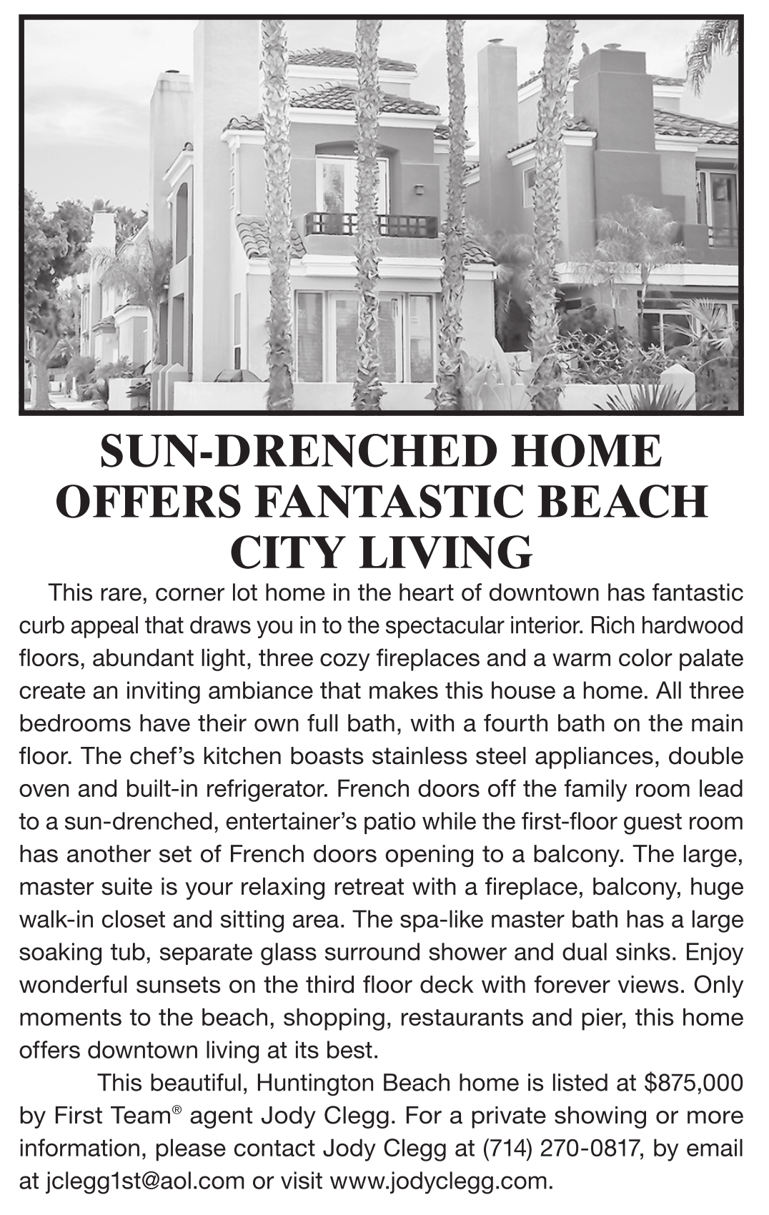 SUN-DRENCHED HOME OFFERS FANTASTIC BEACH CITY LIVING This rare, corner lot home in the heart of downtown has fantastic curb appeal that draws you in to the spectacular interior. Rich hardwood floors, abundant light, three cozy fireplaces and a warm color palate create an inviting ambiance that makes this house a home. All three bedrooms have their own full bath, with a fourth bath on the main floor. The chef’s kitchen boasts stainless steel appliances, double oven and built-in refrigerator. French doors off the family room lead to a sun-drenched, entertainer’s patio while the first-floor guest room has another set of French doors opening to a balcony. The large, master suite is your relaxing retreat with a fireplace, balcony, huge walk-in closet and sitting area. The spa-like master bath has a large soaking tub, separate glass surround shower and dual sinks. Enjoy wonderful sunsets on the third floor deck with forever views. Only moments to the beach, shopping, restaurants and pier, this home offers downtown living at its best. This beautiful, Huntington Beach home is listed at $875,000 by First Team ® agent Jody Clegg. For a private showing or more information, please contact Jody Clegg at (714) 270-0817, by email at jclegg1st@aol.com or visit www.jodyclegg.com.