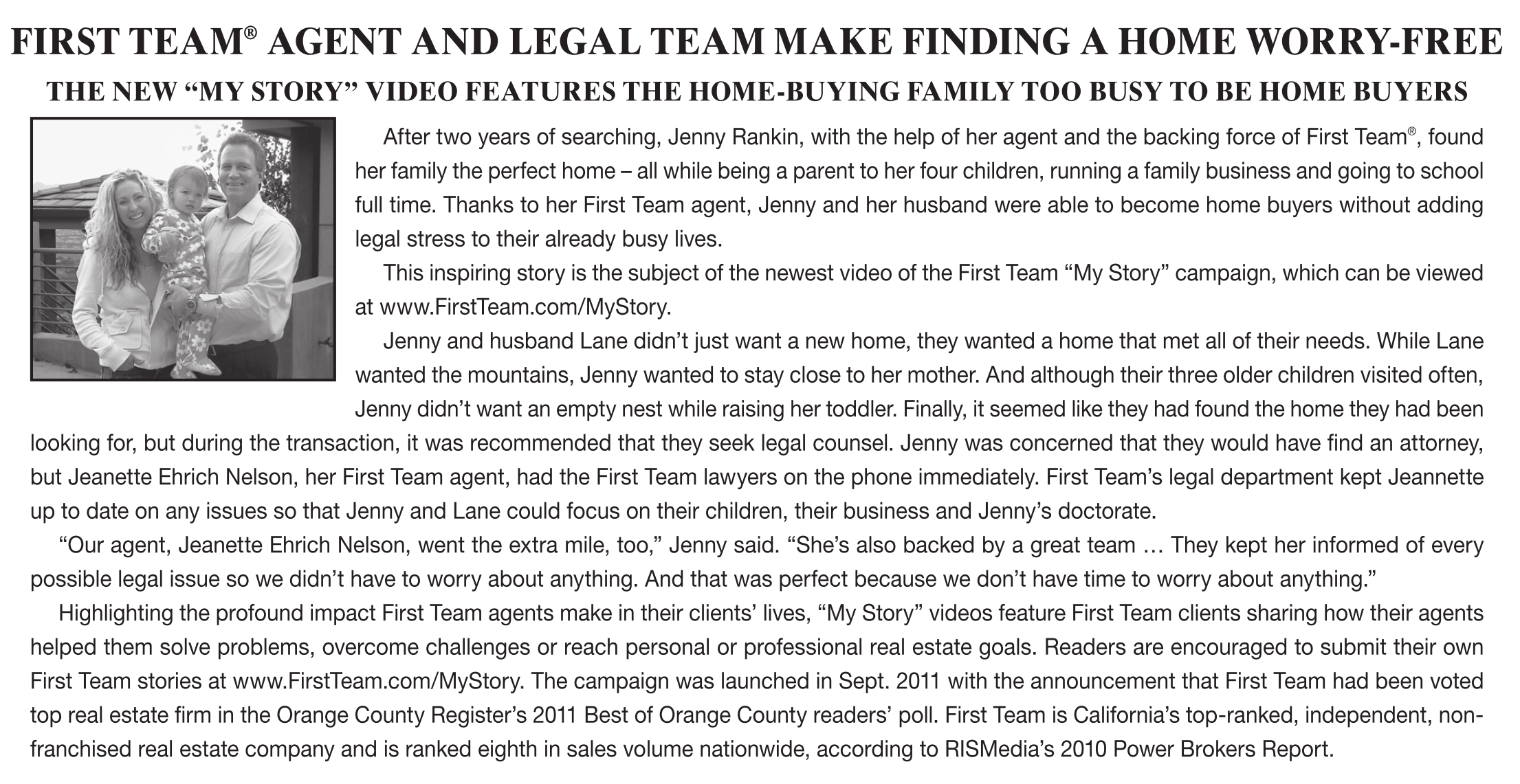 Highlighting the profound impact First Team agents make in their clients’ lives, “My Story” videos feature First Team clients sharing how their agents helped them solve problems, overcome challenges or reach personal or professional real estate goals. Readers are encouraged to submit their own First Team stories at www.FirstTeam.com/MyStory. The campaign was launched in Sept. 2011 with the announcement that First Team had been voted top real estate firm in the Orange County Register’s 2011 Best of Orange County readers’ poll. First Team is California’s top-ranked, independent, nonfranchised real estate company and is ranked eighth in sales volume nationwide, according to RISMedia’s 2010 Power Brokers Report.