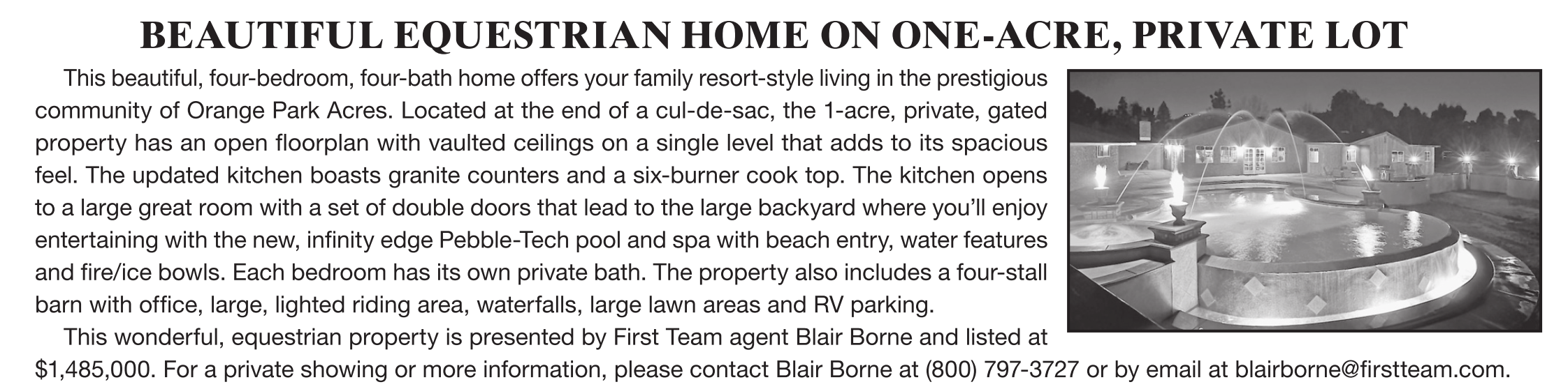 BEAUTIFUL EQUESTRIAN HOME ON ONE-ACRE, PRIVATE LOT This beautiful, four-bedroom, four-bath home offers your family resort-style living in the prestigious community of Orange Park Acres. Located at the end of a cul-de-sac, the 1-acre, private, gated property has an open floorplan with vaulted ceilings on a single level that adds to its spacious feel. The updated kitchen boasts granite counters and a six-burner cook top. The kitchen opens to a large great room with a set of double doors that lead to the large backyard where you’ll enjoy entertaining with the new, infinity edge Pebble-Tech pool and spa with beach entry, water features and fire/ice bowls. Each bedroom has its own private bath. The property also includes a four-stall barn with office, large, lighted riding area, waterfalls, large lawn areas and RV parking. This wonderful, equestrian property is presented by First Team agent Blair Borne and listed at $1,485,000. For a private showing or more information, please contact Blair Borne at (800) 797-3727 or by email at blairborne@fi rstteam.com.