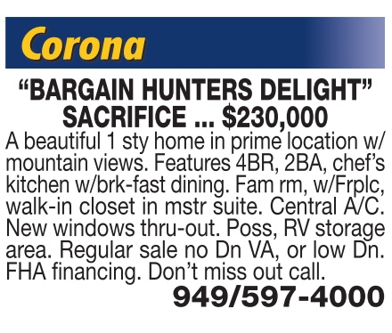 Corona “BARGAIN HUNTERS DELIGHT” SACRIFICE ... $230,000 A beautiful 1 sty home in prime location w/ mountain views. Features 4BR, 2BA, chef’s kitchen w/brk-fast dining. Fam rm, w/Frplc, walk-in closet in mstr suite. Central A/C. New windows thru-out. Poss, RV storage area. Regular sale no Dn VA, or low Dn. FHA financing. Don’t miss out call. 949/597-4000