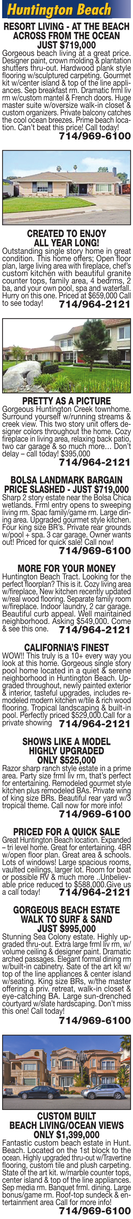 CUSTOM BUILT BEACH LIVING/OCEAN VIEWS ONLY $1,399,000 Fantastic custom beach estate in Hunt. Beach. Located on the 1st block to the ocean. Highly upgraded thru-out w/Travertine flooring, custom tile and plush carpeting. State of the art kit. w/marble counter tops, center island & top of the line appliances. Sep media rm. Banquet frml. dining. Large bonus/game rm. Roof-top sundeck & entertainment area Call for more info!