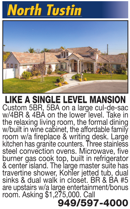 North Tustin LIKE A SINGLE LEVEL MANSION Custom 5BR, 5BA on a large cul-de-sac w/4BR & 4BA on the lower level. Take in the relaxing living room, the formal dining w/built in wine cabinet, the affordable family room w/a fireplace & writing desk. Large kitchen has granite counters. Three stainless steel convection ovens. Microwave, five burner gas cook top, built in refrigerator & center island. The large master suite has travertine shower, Kohler jetted tub, dual sinks & dual walk in closet. BR & BA #5 are upstairs w/a large entertainment/bonus room. Asking $1,275,000. Call 949/597-4000